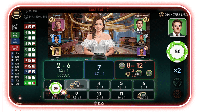 “Rolling 7” is a simple dice game played with two dice. Players bet on the sum of the two dice after each roll. Other than 7, other results are divided into two groups: 2-6 and 8-12.